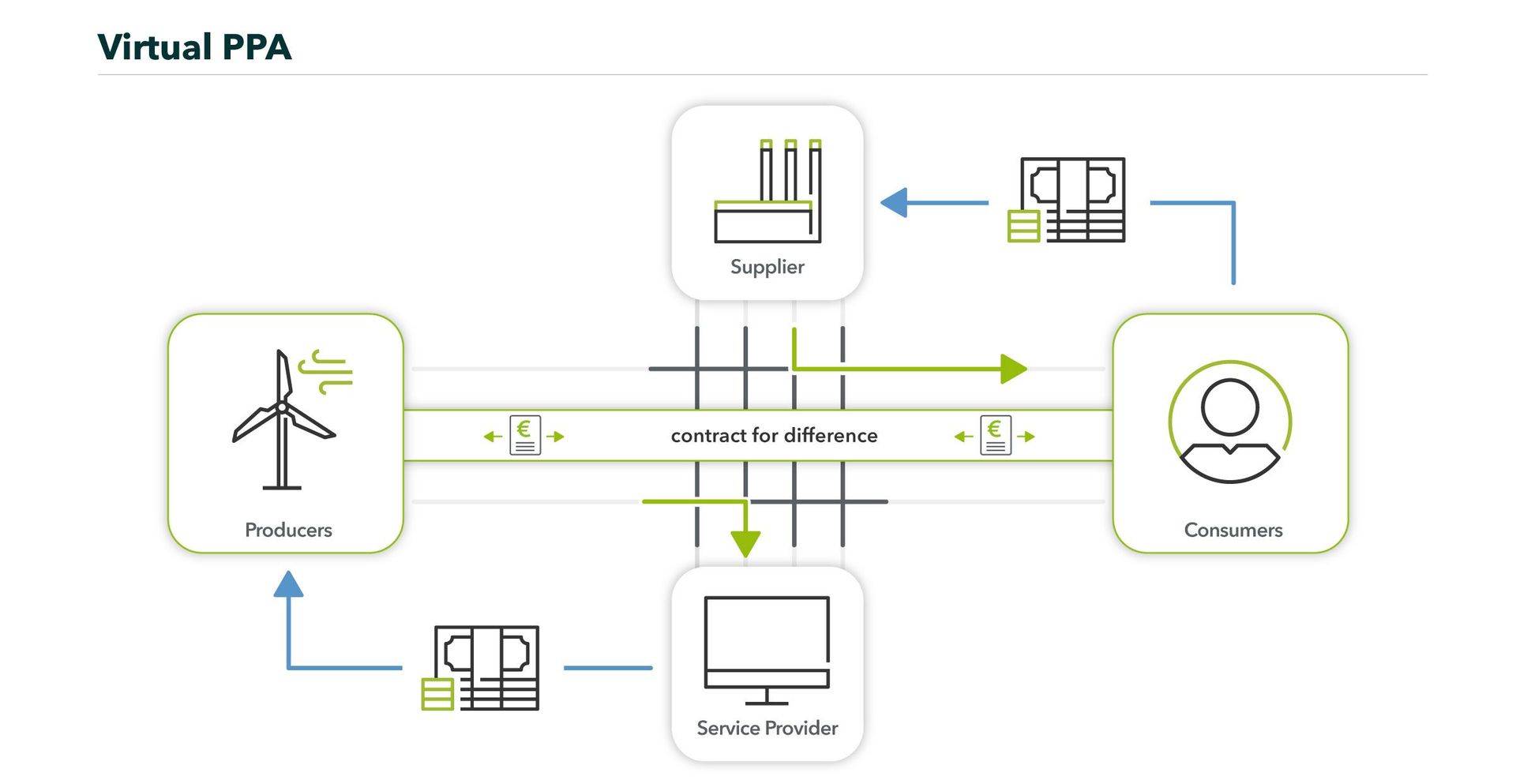 Comme il n'est pas nécessaire d'installer l'installation de production à proximité du client d'électricité, une flexibilité supplémentaire est créée, car l'exploitant de l'installation peut désormais choisir des sites présentant des conditions optimales ou une installation éolienne ou solaire existante. Une centrale peut également conclure plusieurs PPA avec différents clients, qui achètent et paient une partie de la production d'électricité par le biais de leurs groupes d'équilibrage. Le prix de la fourniture d'électricité est fixé dans le PPA, ce qui donne à tous les participants une certitude de prix à long terme. Les coûts et les frais de réseau sont également payés à l'exploitant du réseau. Les garanties d'origine générées lors de la production d'électricité peuvent être et sont généralement transférées au client.
